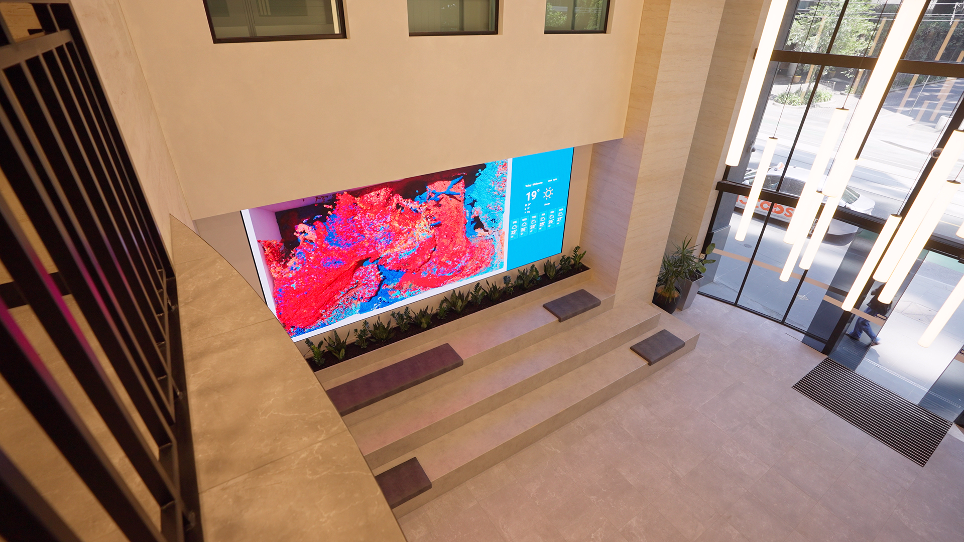 - Seamless Integration: The LED screen was carefully integrated into the entrance design, complementing the building’s architecture and premium aesthetic.